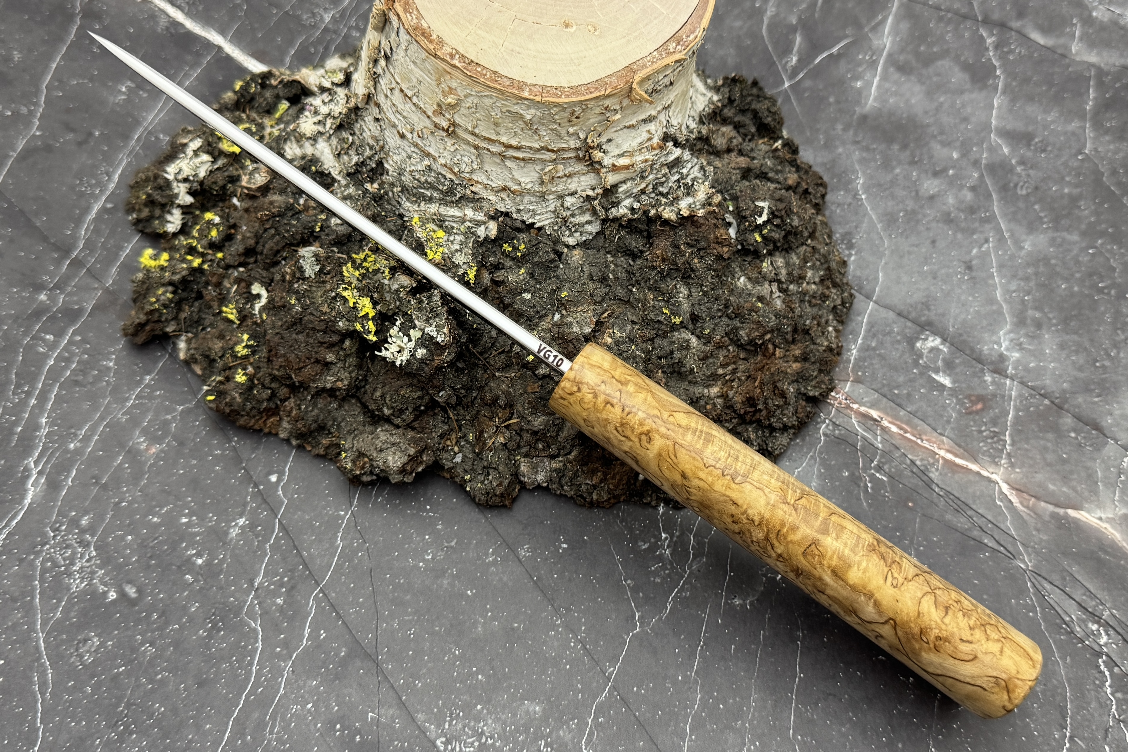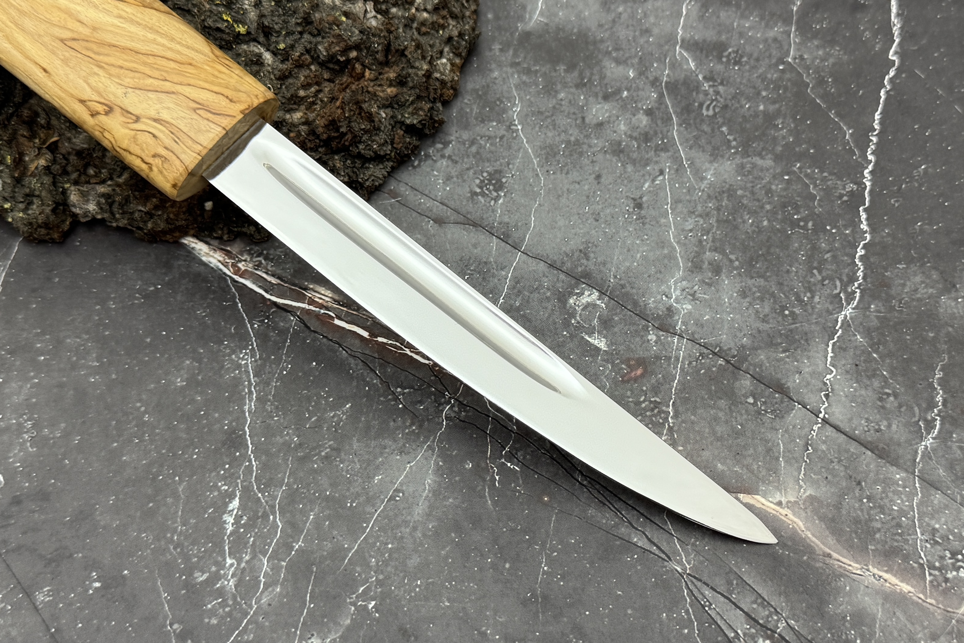 Выполнен нож из нержавеющей японской стали VG-10, рукоять из карельской березы.