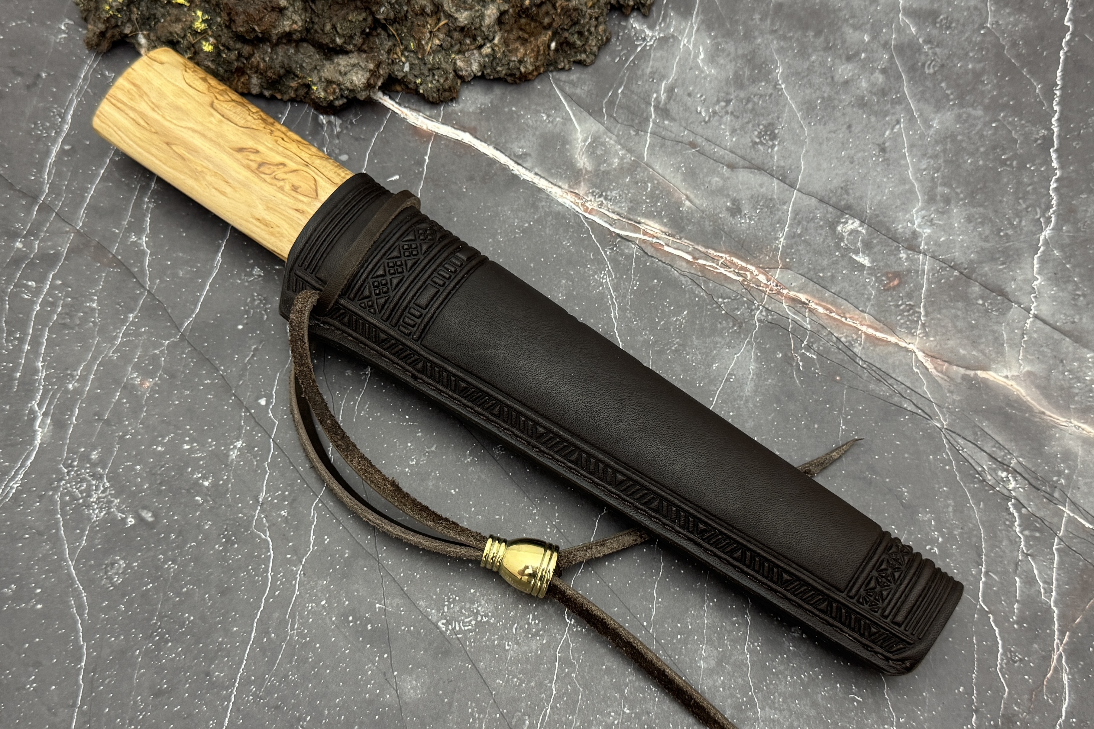 Клинок 150×22×3.7 мм, выполнен из стали VG-10. Рукоять 130 мм: карельская берёза. Ножны из премиальной кожи с орнаментом, внутри деревянная вставка