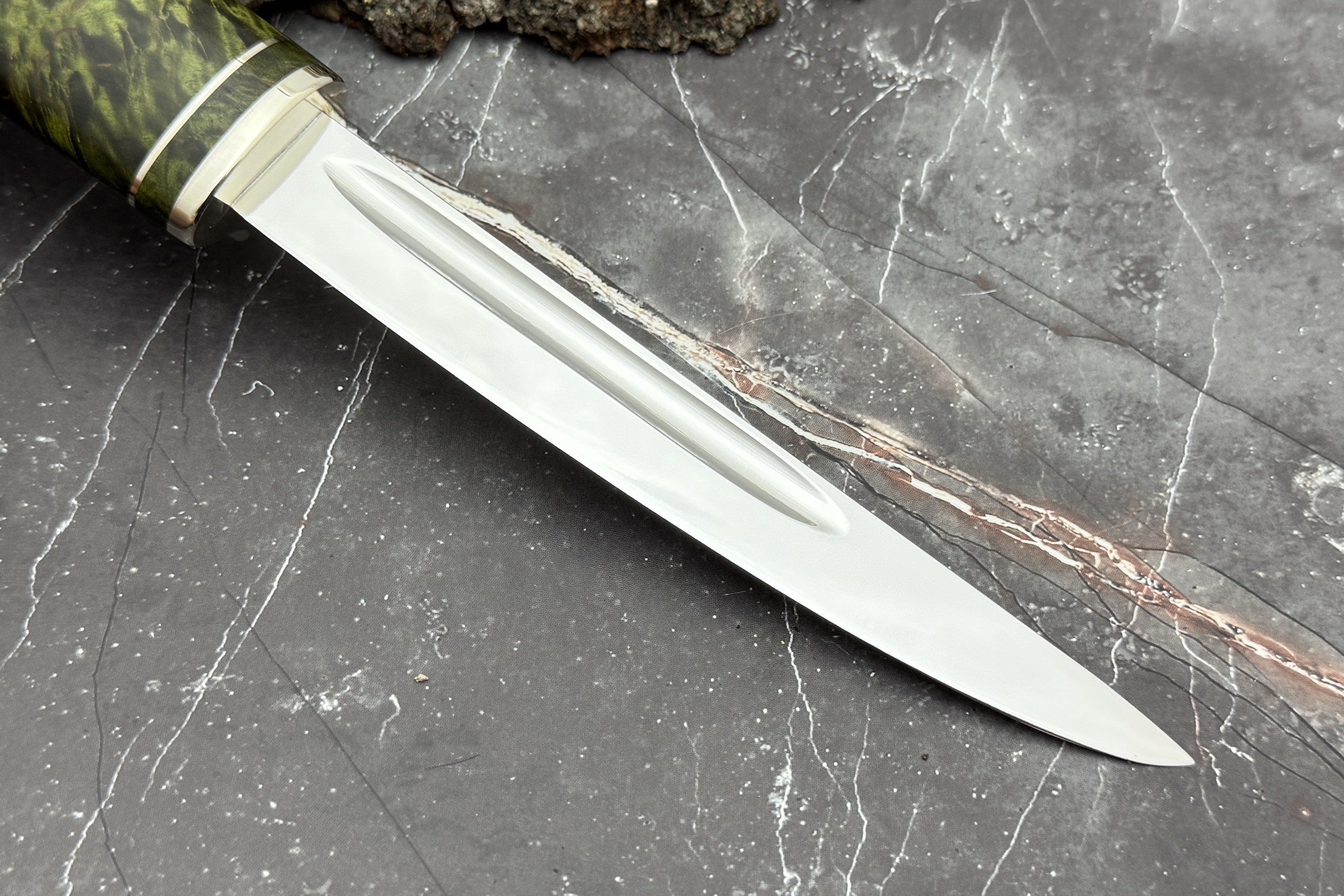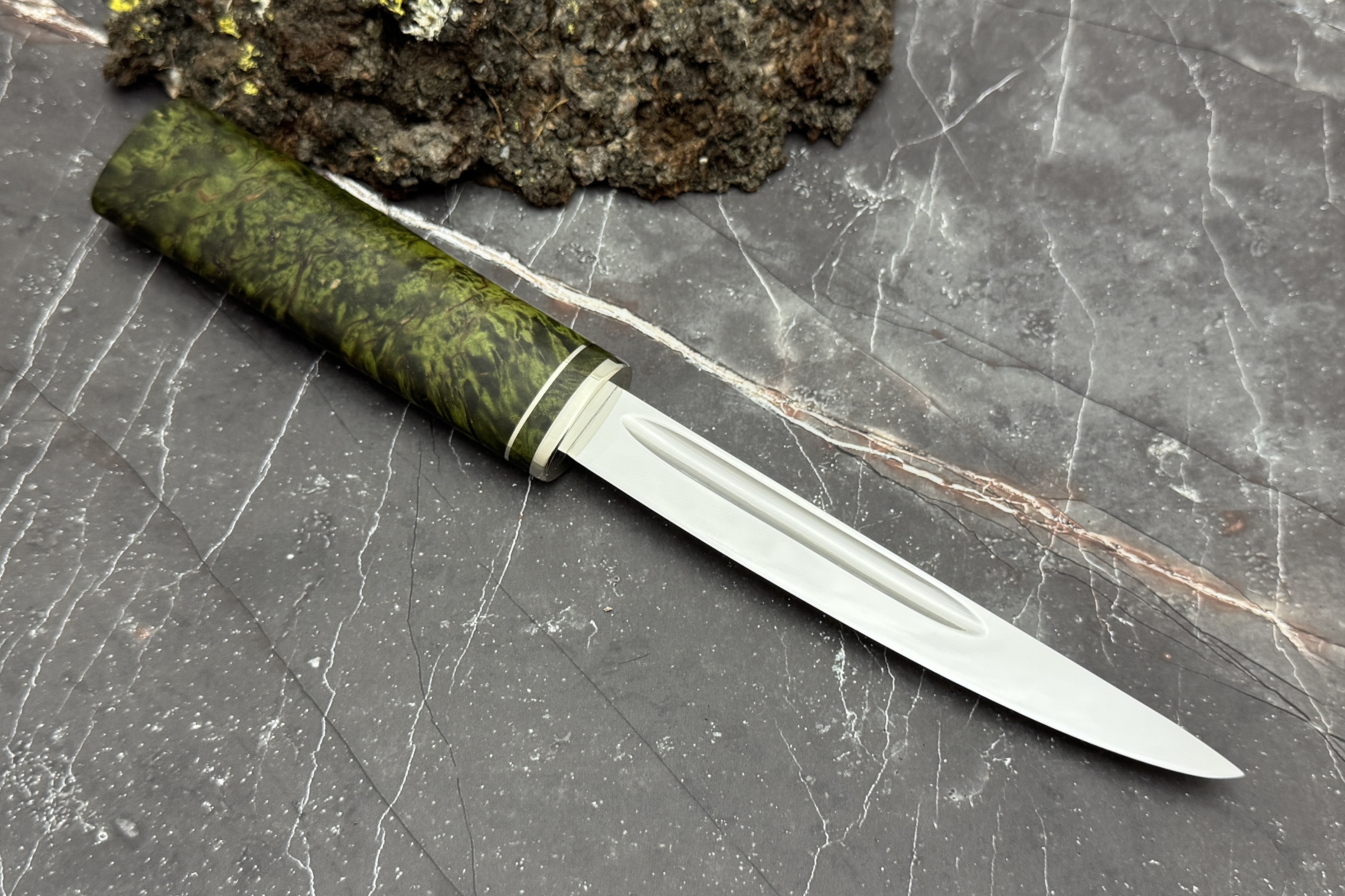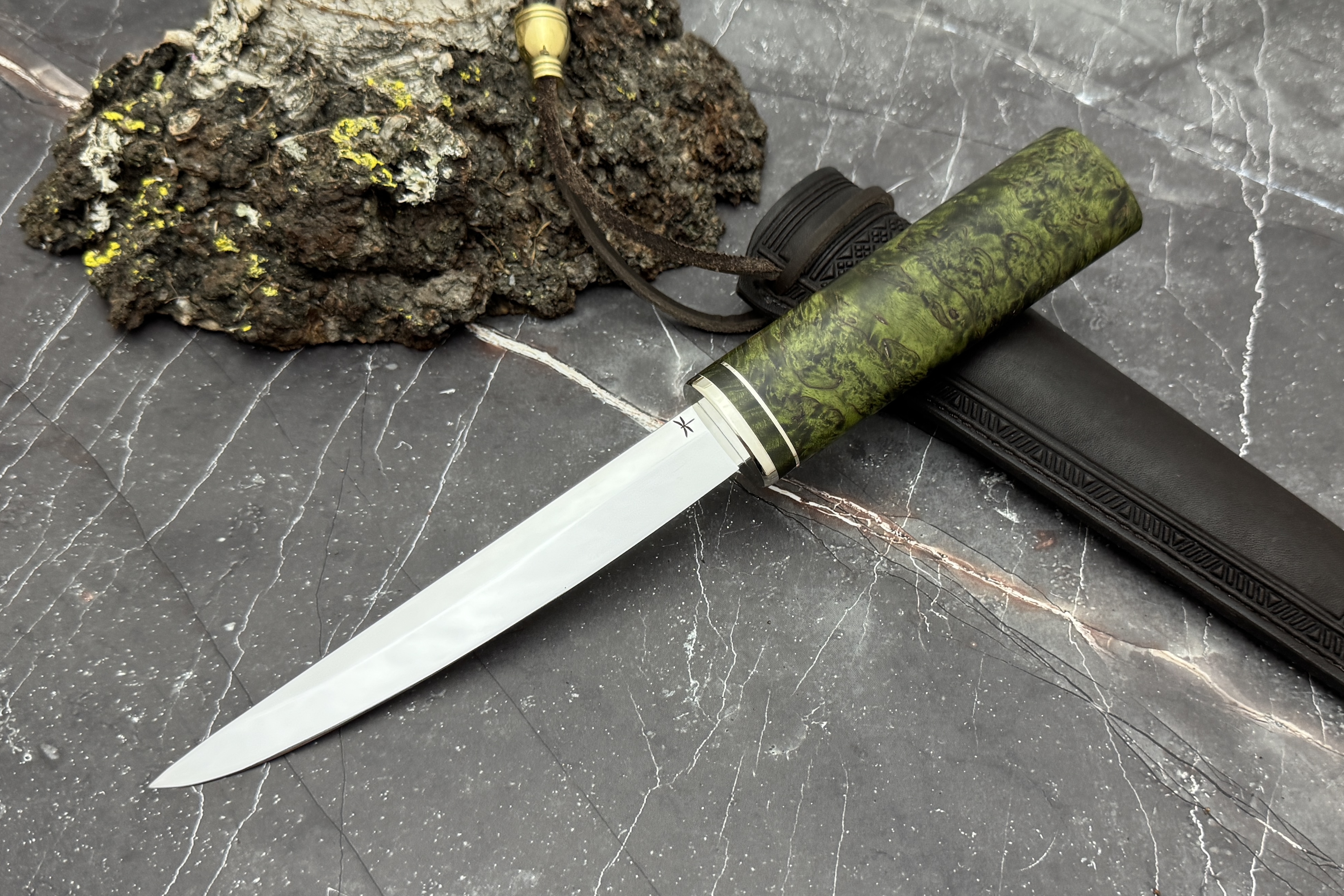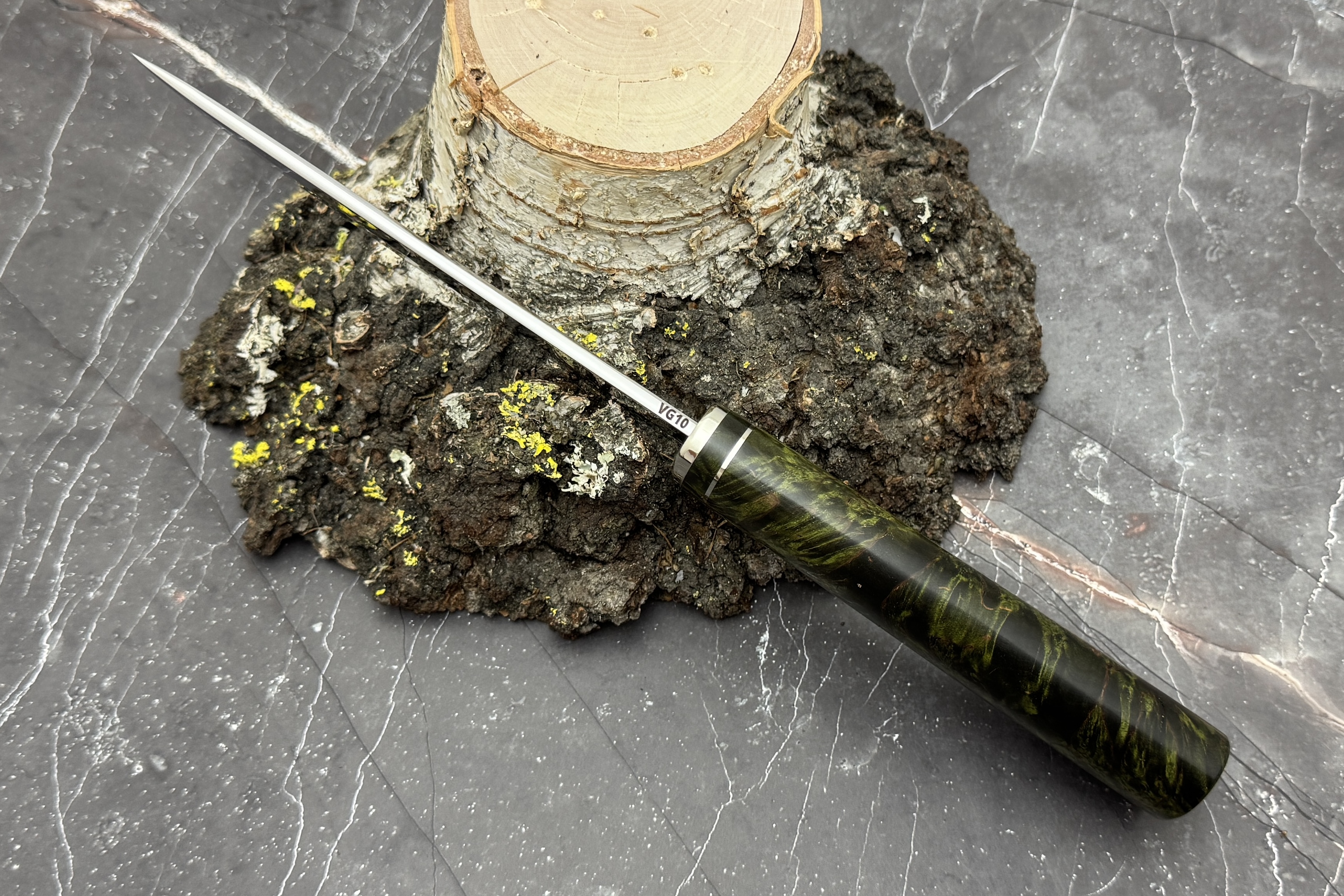 Выполнен нож из нержавеющей японской стали VG-10, рукоять из стабилизированной карельской березы, больстер нейзильбер.