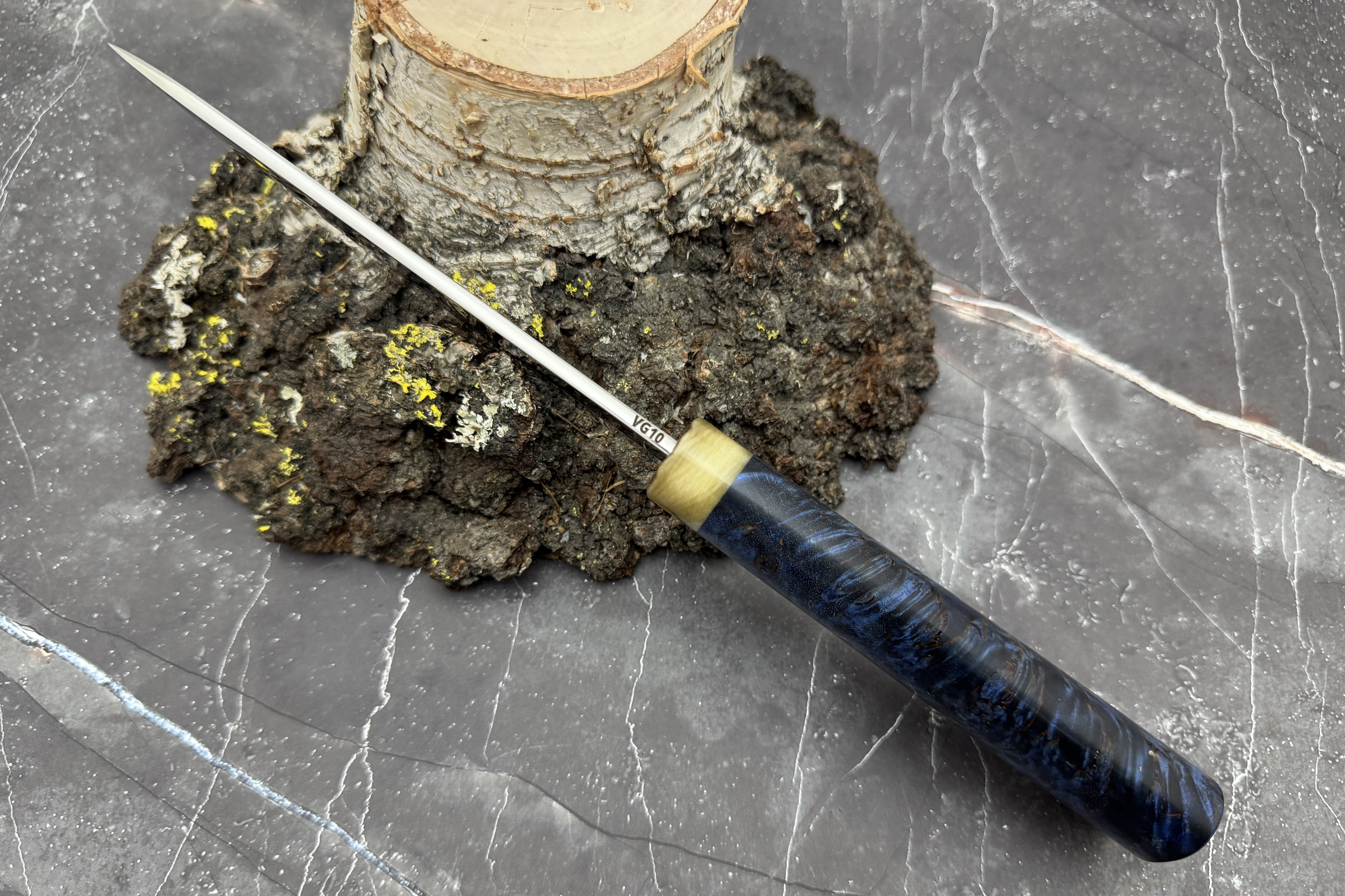 Выполнен нож из нержавеющей японской стали VG-10, рукоять из стабилизированного капа якутской березы, больстер из рога горного барана чубуку.