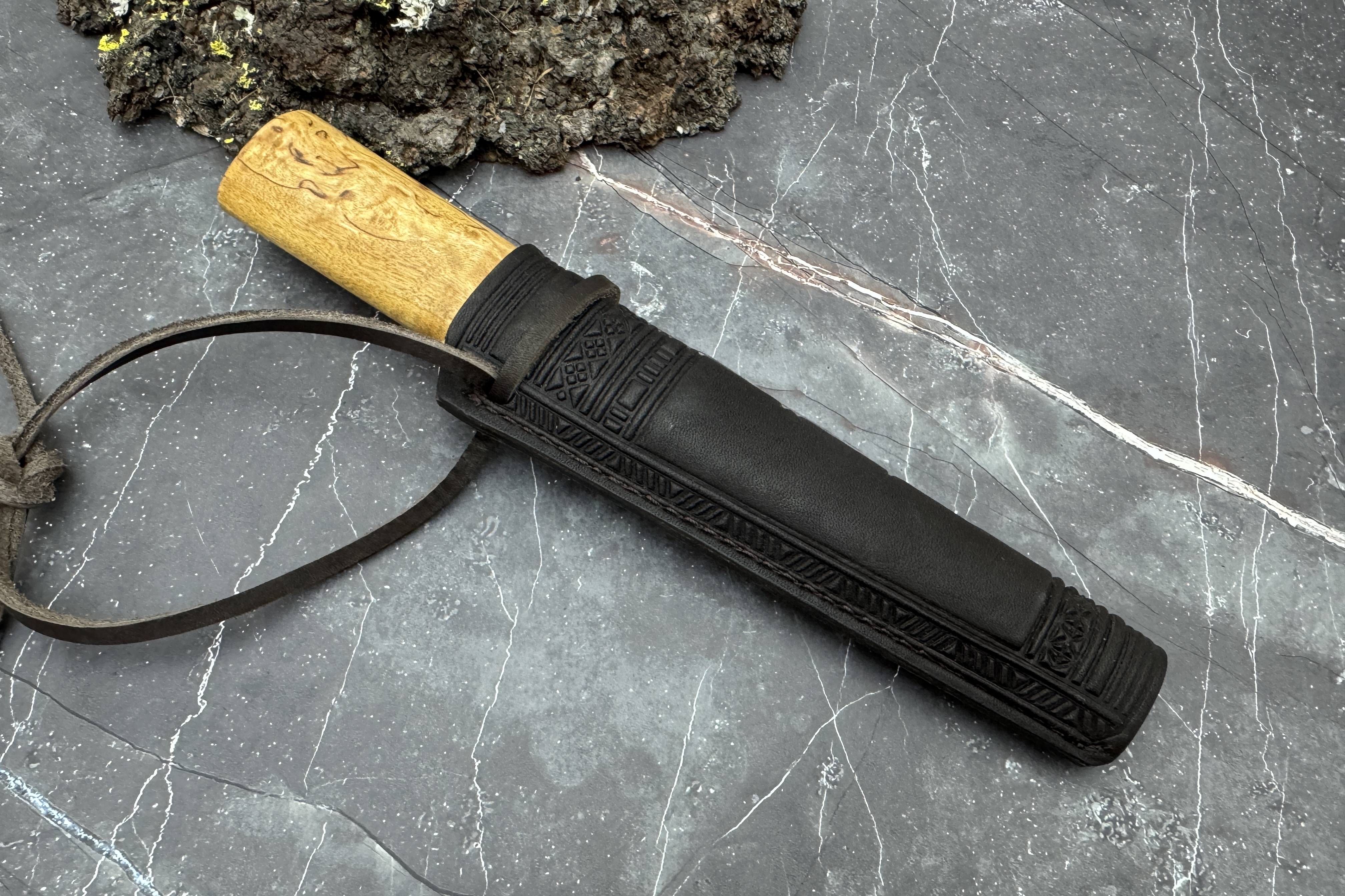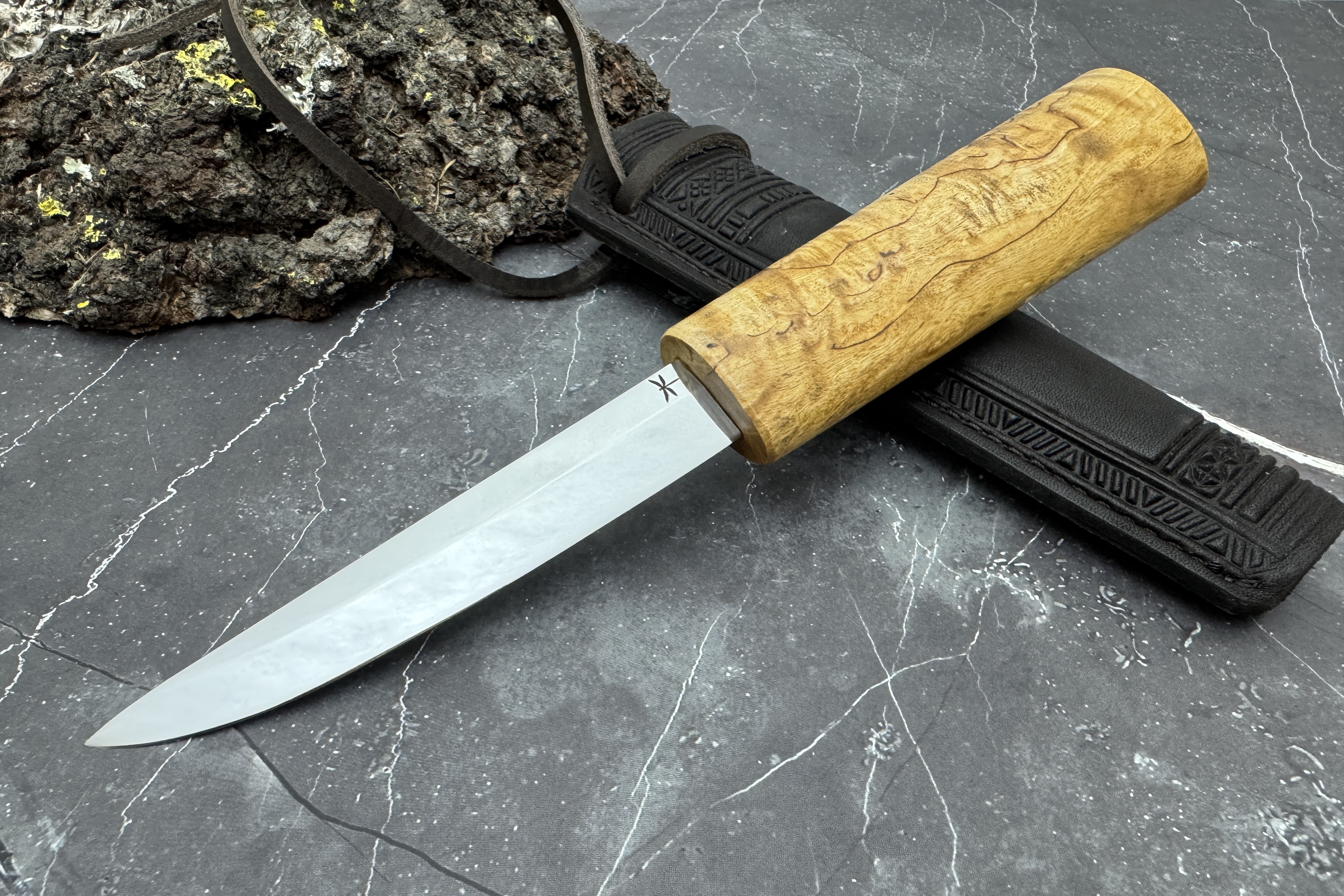 Клинок 110×22×3.7 мм, выполнен из стали VG-10. Рукоять 110 мм: карельская берёза. Ножны из премиальной кожи с орнаментом, внутри деревянная вставка