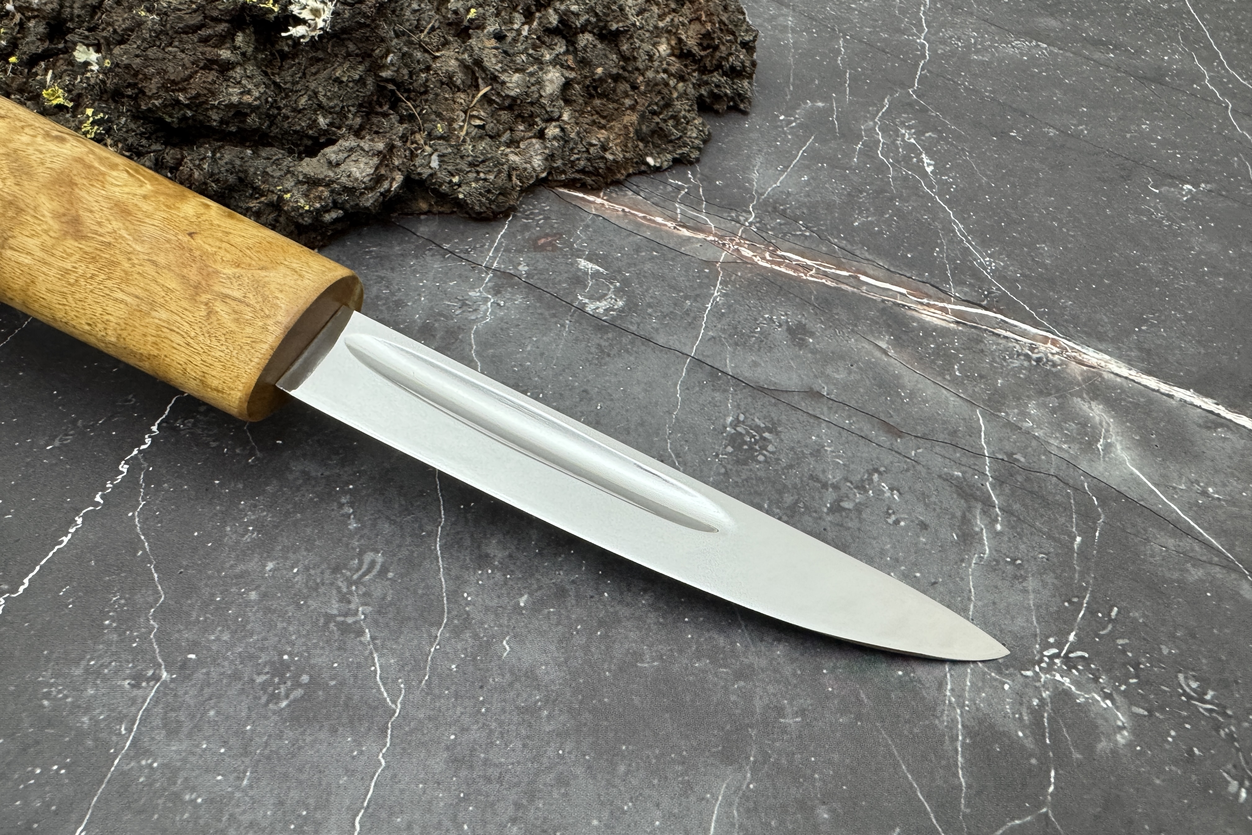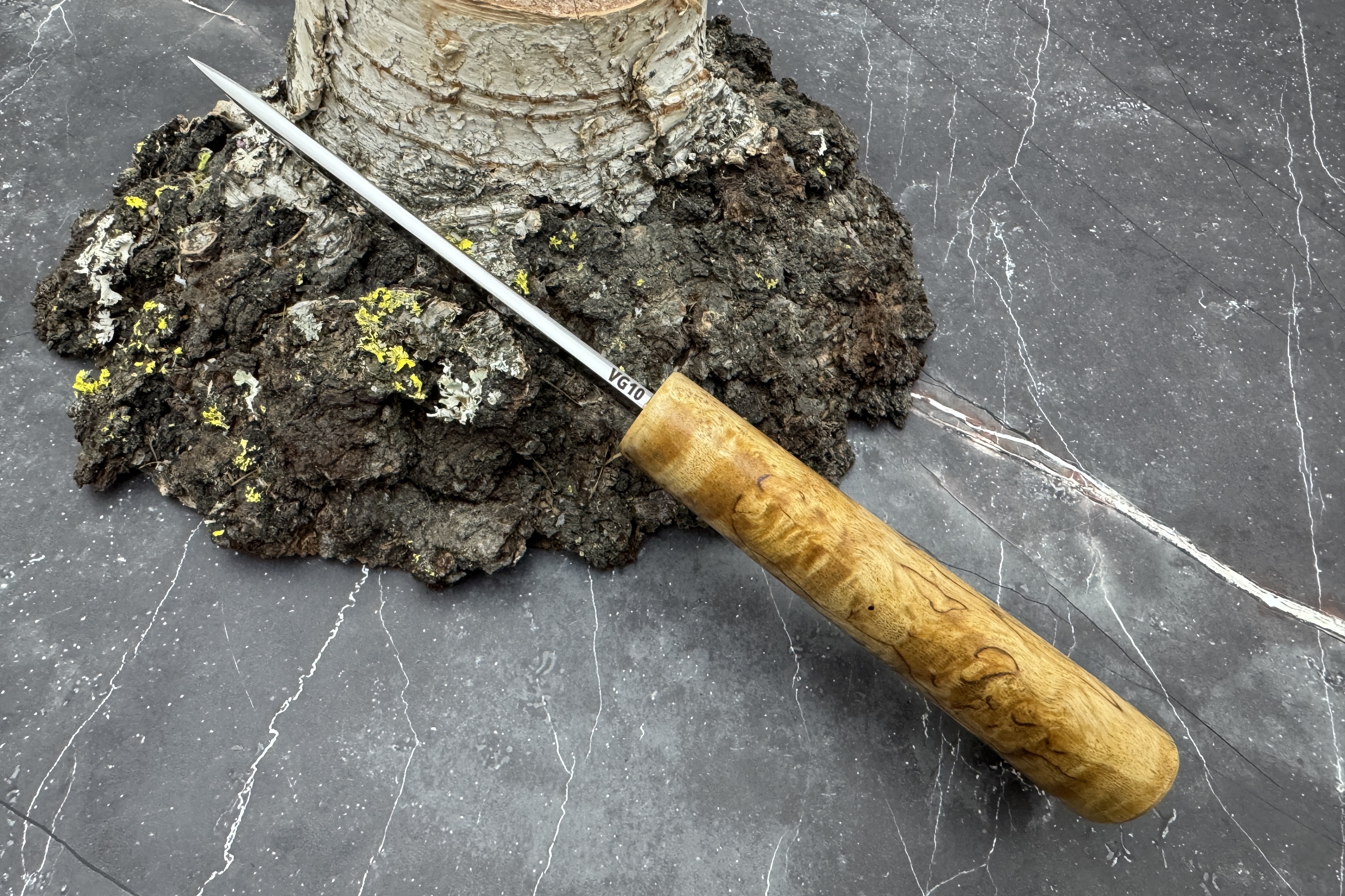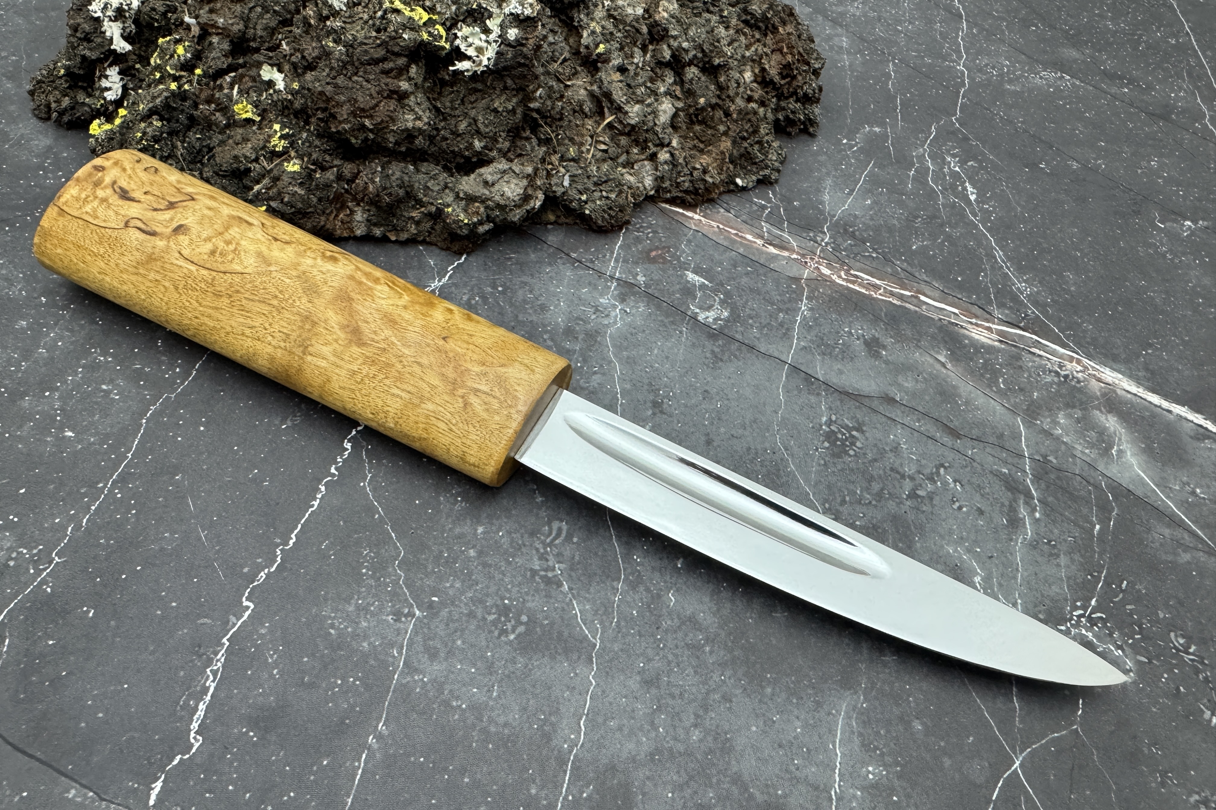 Выполнен нож из нержавеющей японской стали VG-10, рукоять из карельской березы.