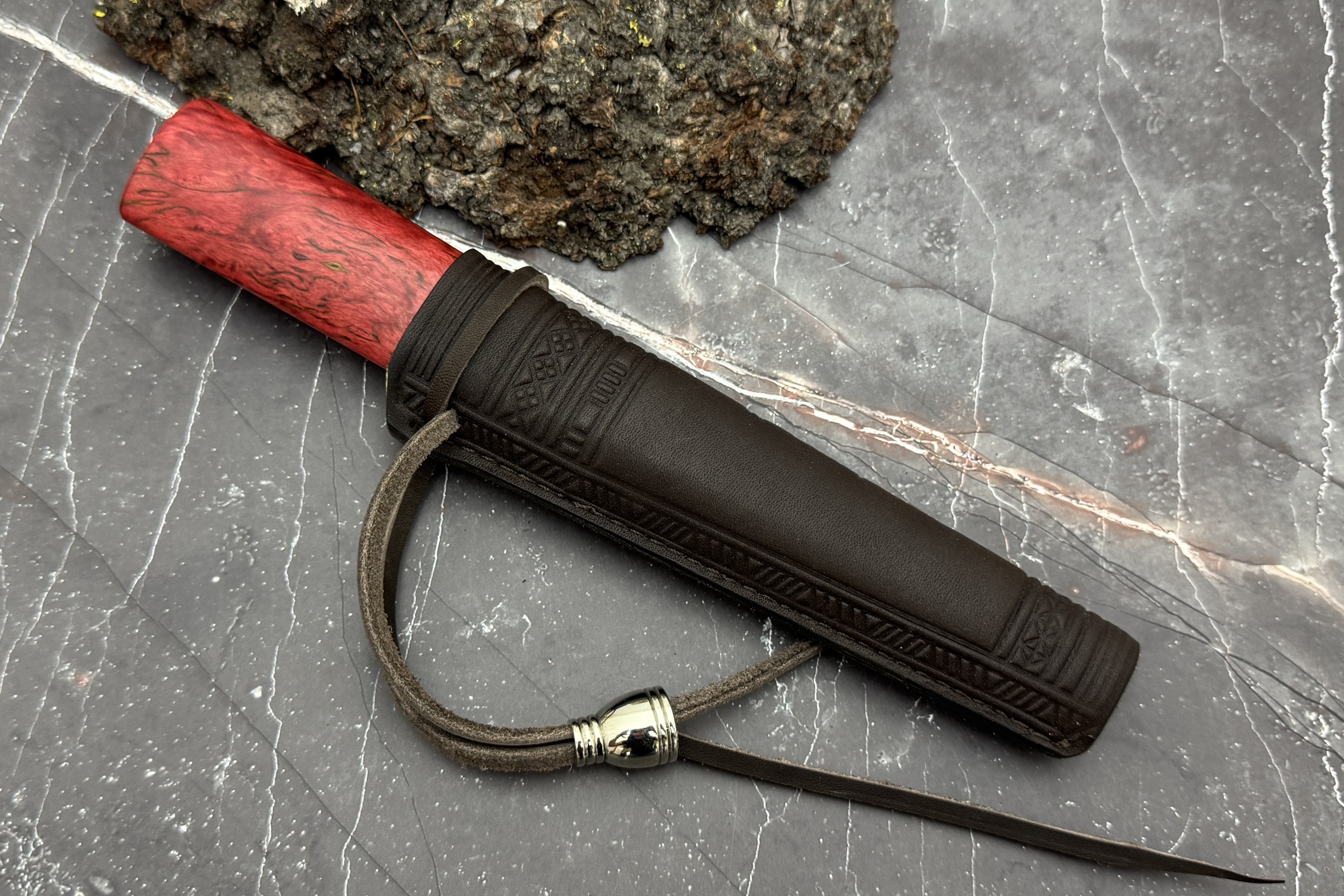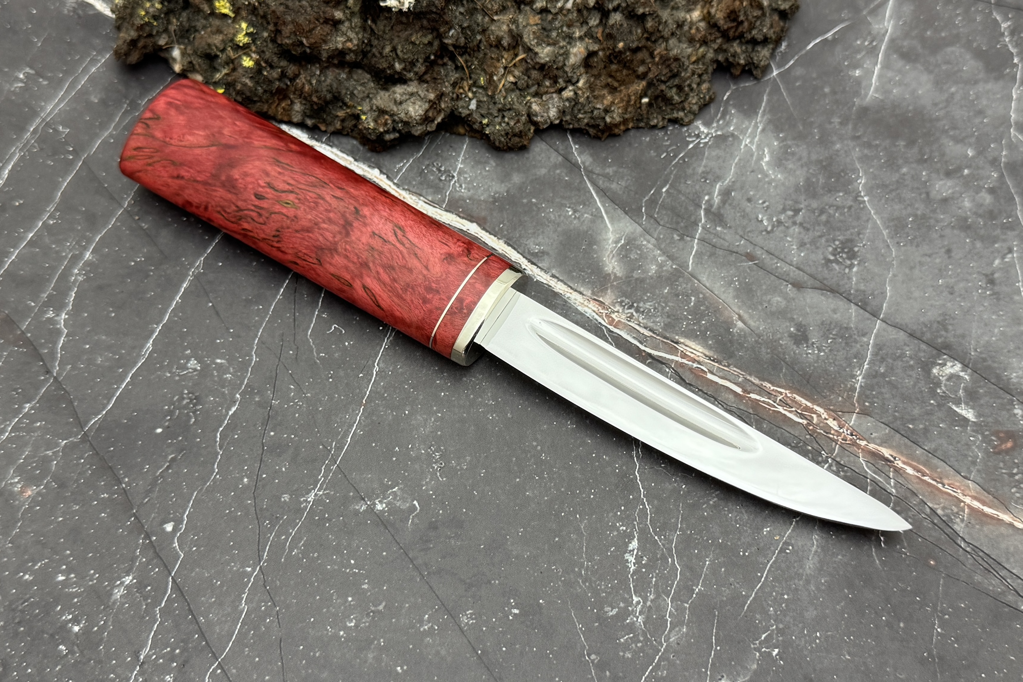 Выполнен нож из нержавеющей японской стали VG-10, рукоять из стабилизированной карельской березы, больстер нейзильбер.