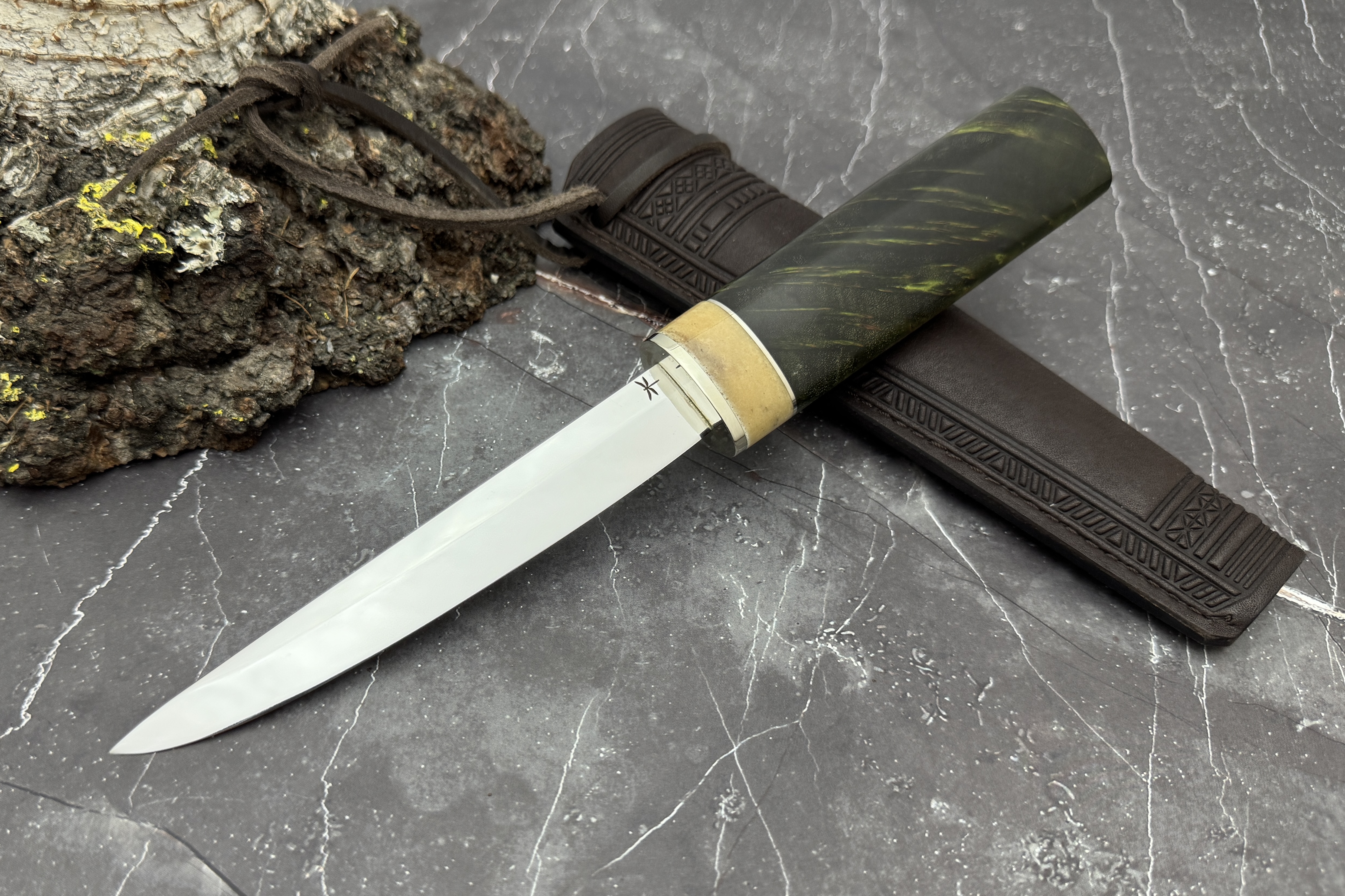 Клинок 130×22×3.7 мм, выполнен из стали D2. Рукоять 120 мм: стабилизированная карельская береза, вставка из рога горного барана чубуку, больстер нейзильбер. Ножны из премиальной кожи с орнаментом, внутри деревянная вставка