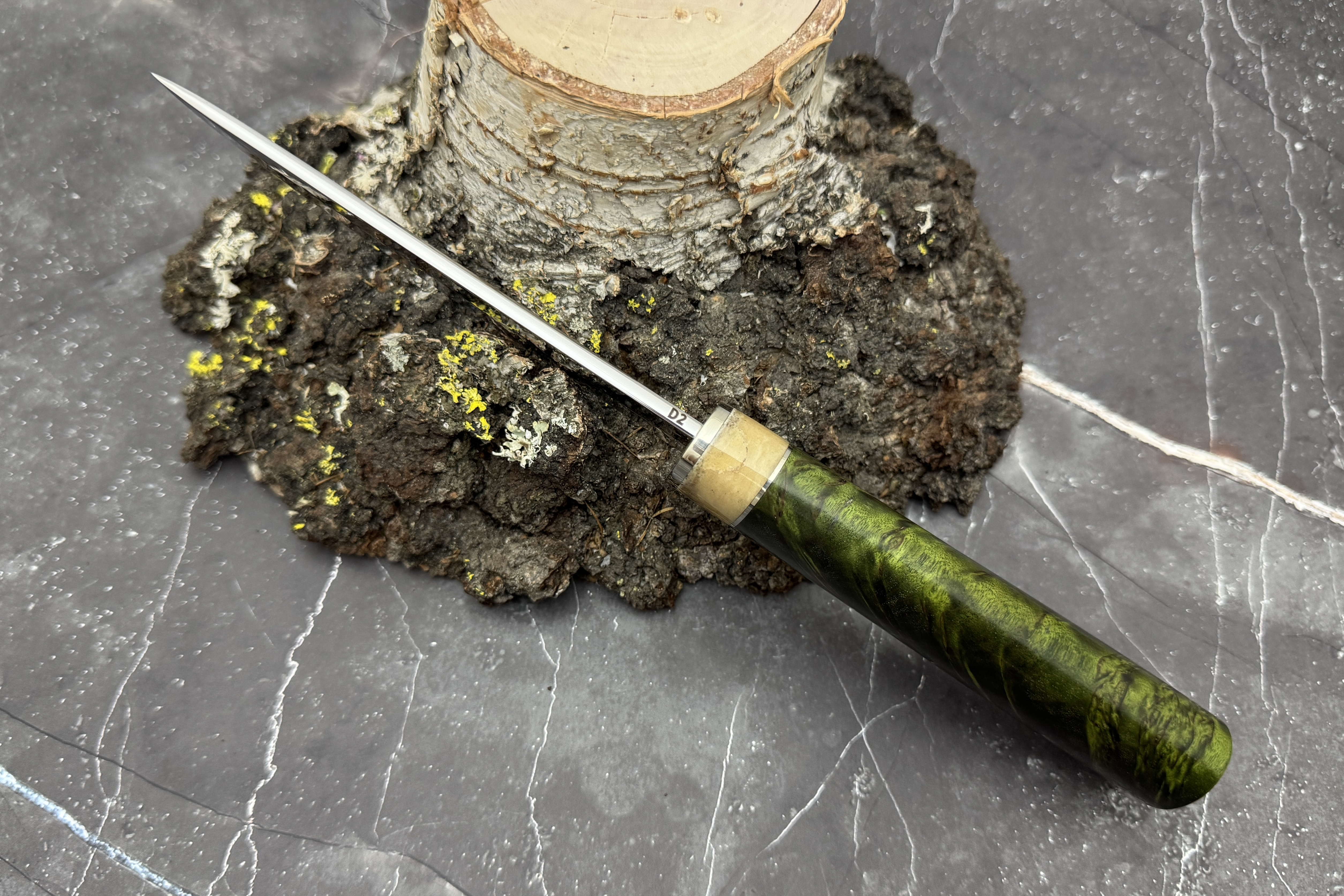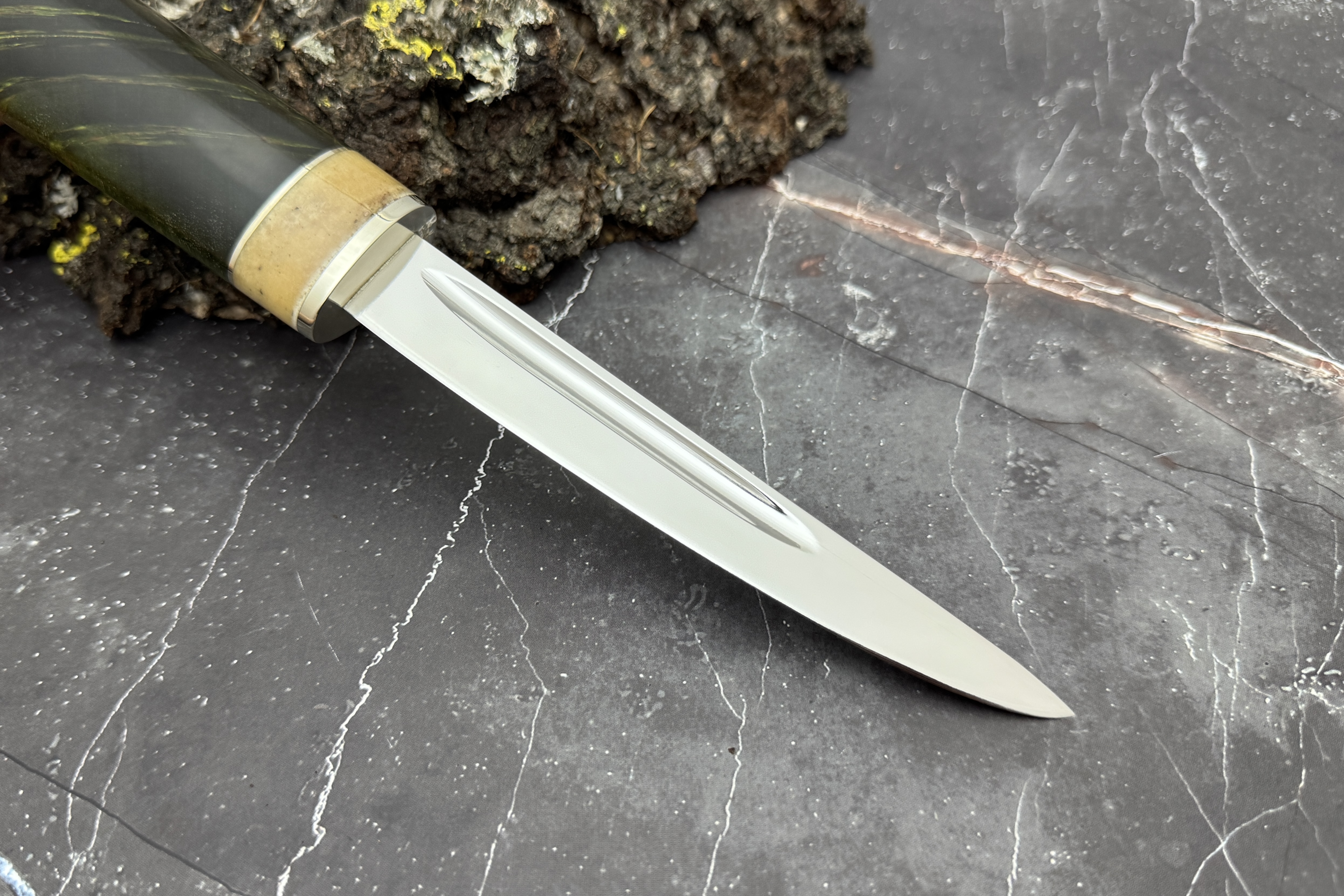 Выполнен нож из стали D2, рукоять из стабилизированной карельской березы, вставка из рога горного барана чубуку, больстер нейзильбер.