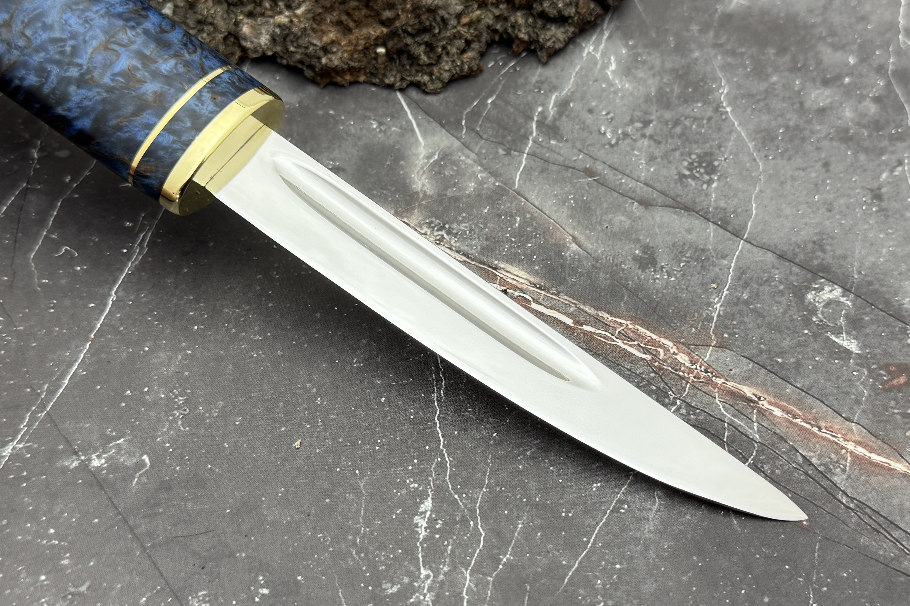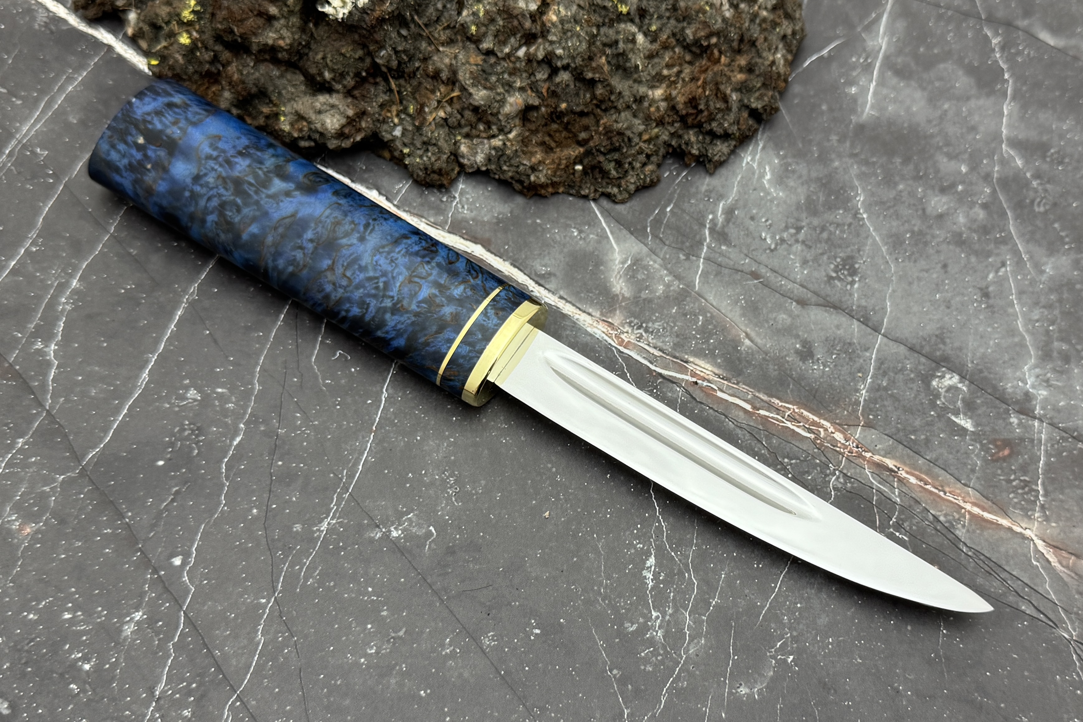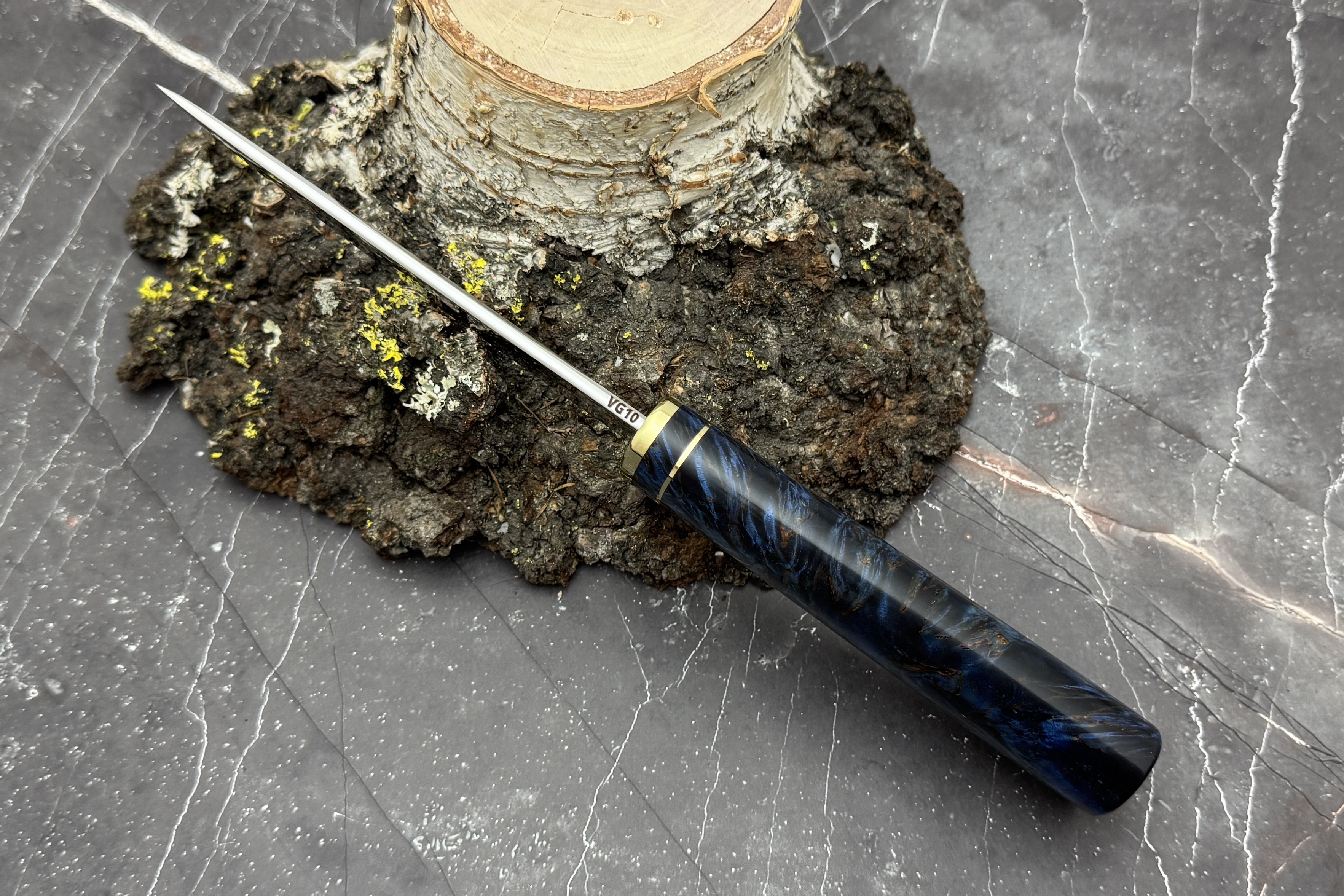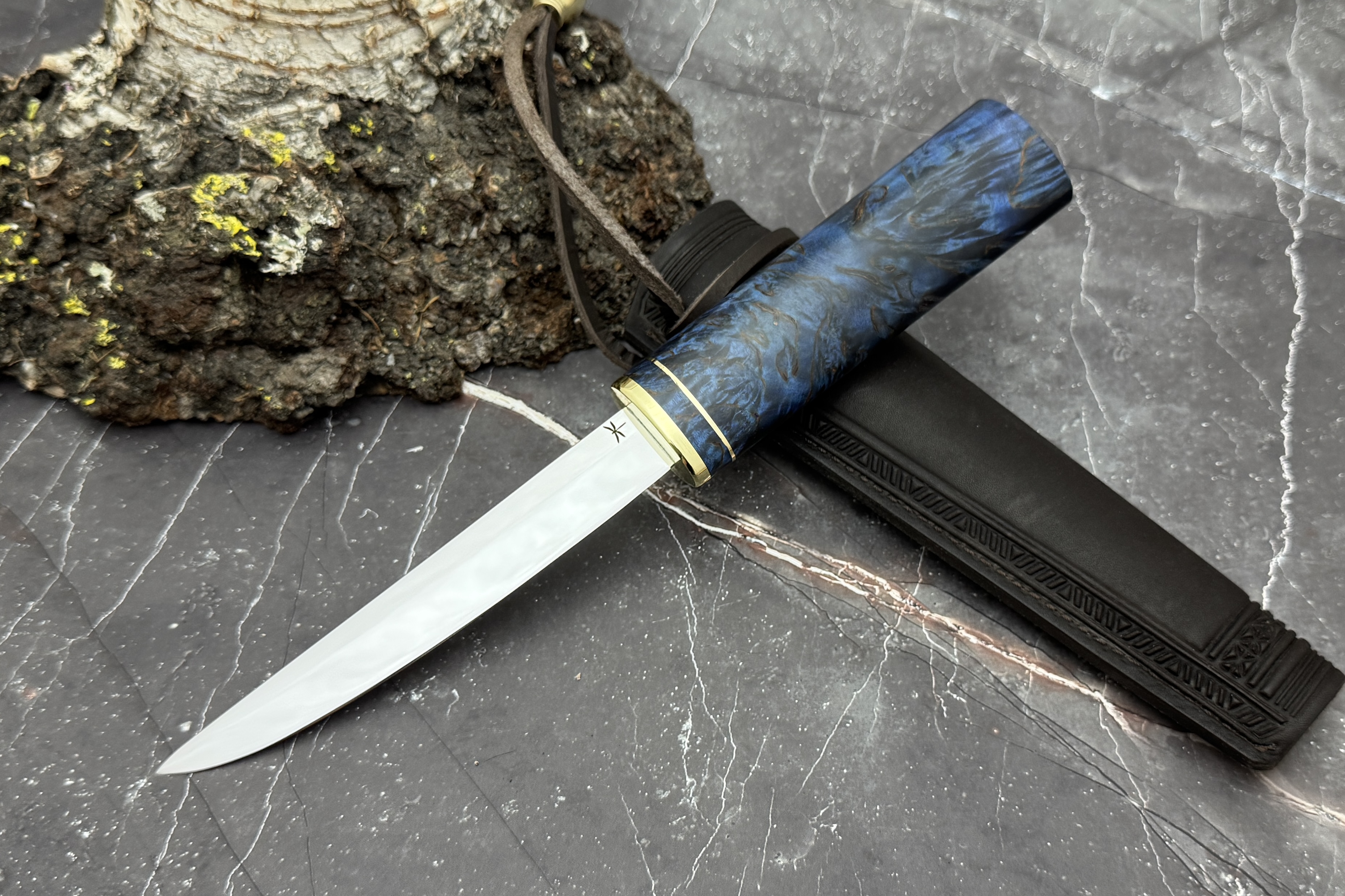 Выполнен нож из нержавеющей японской стали VG-10, рукоять из стабилизированной карельской березы, больстер латунь.