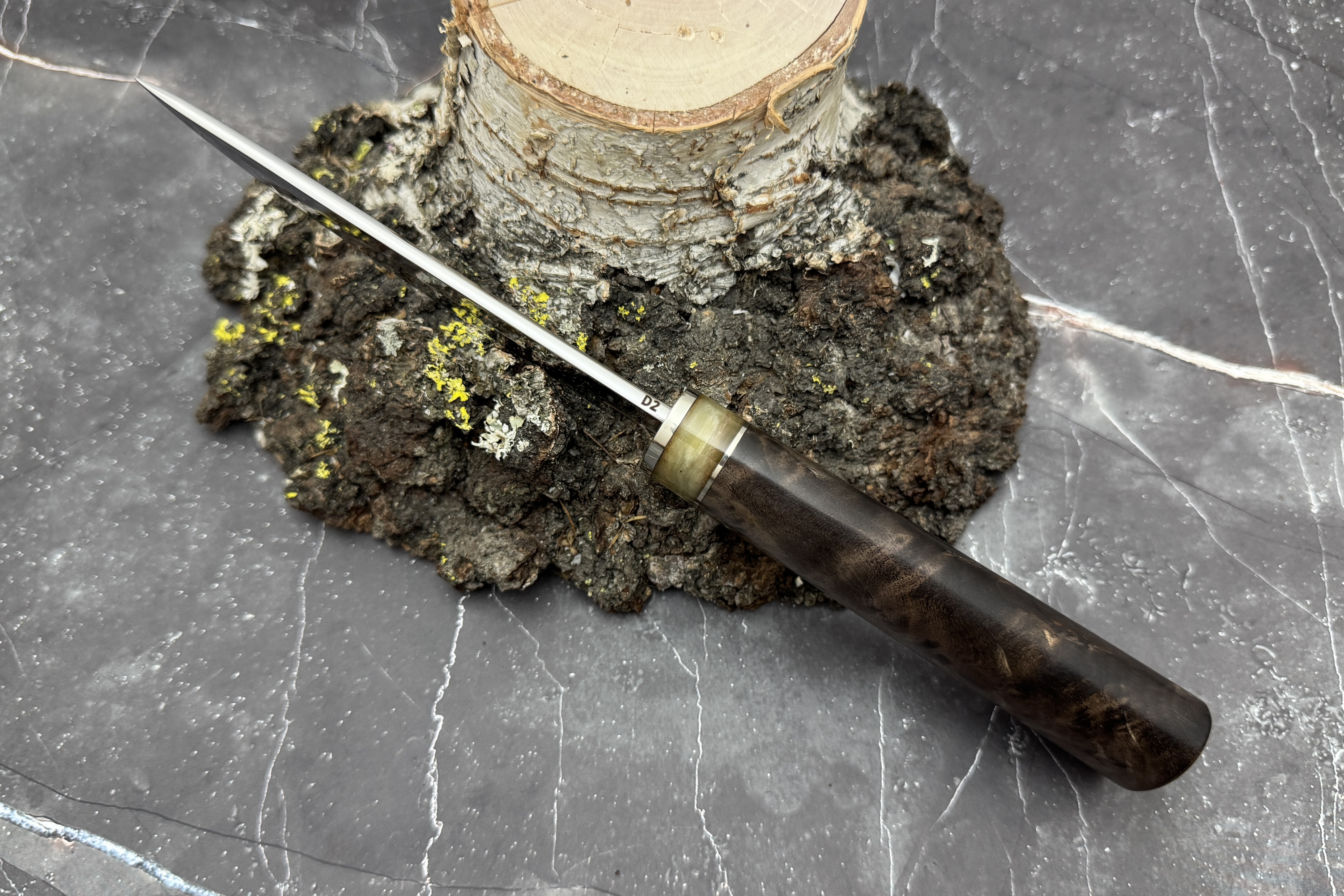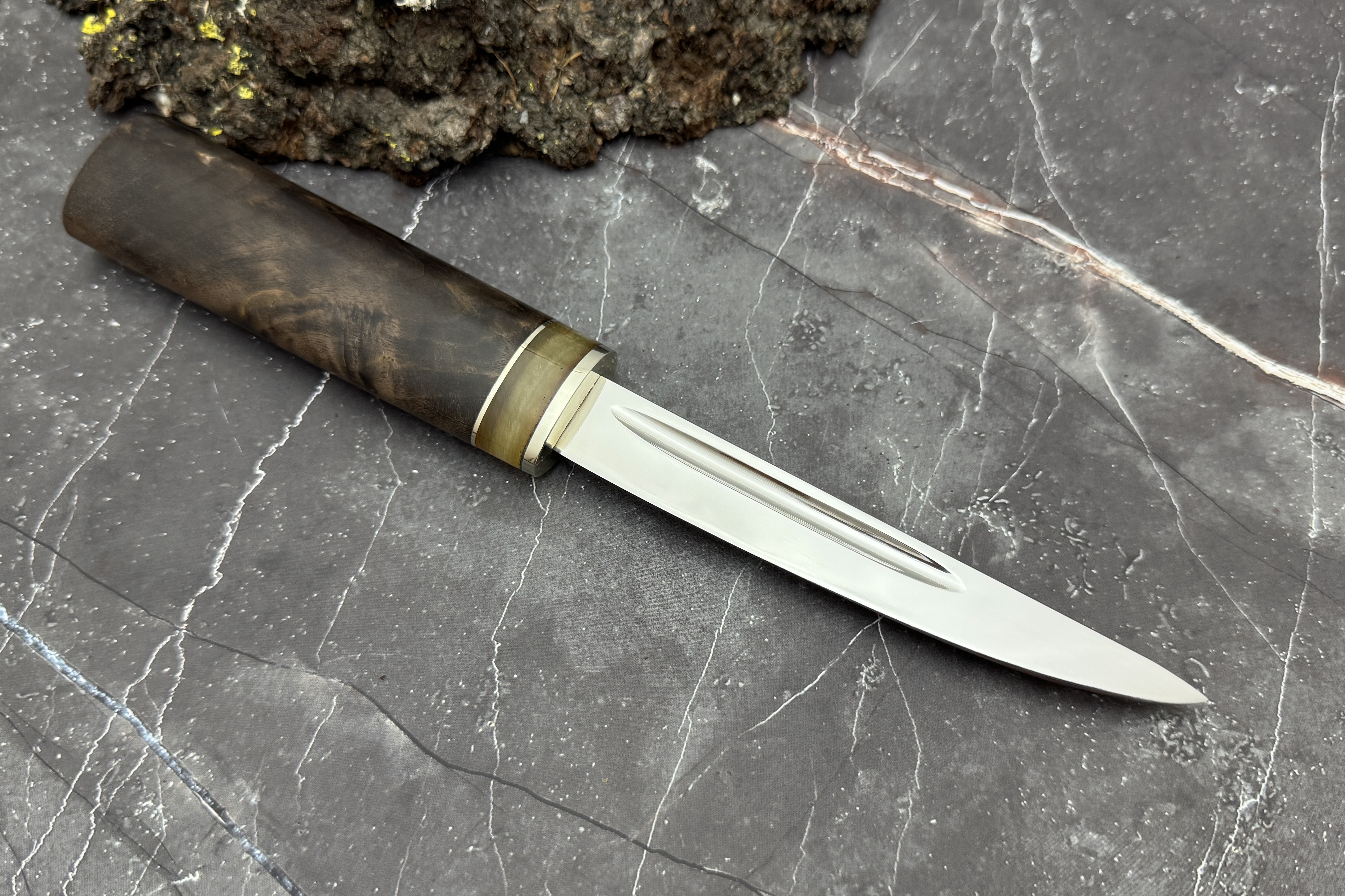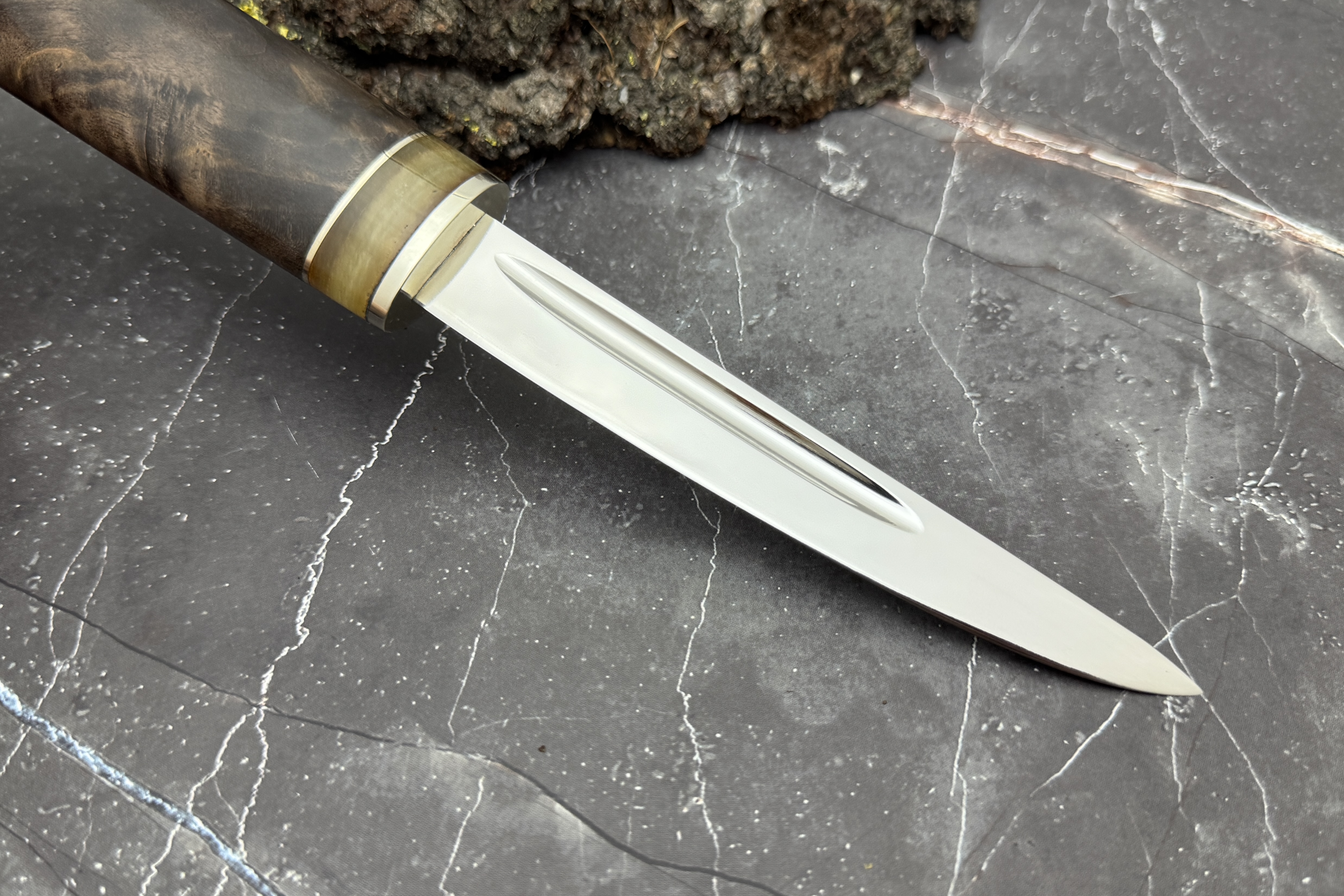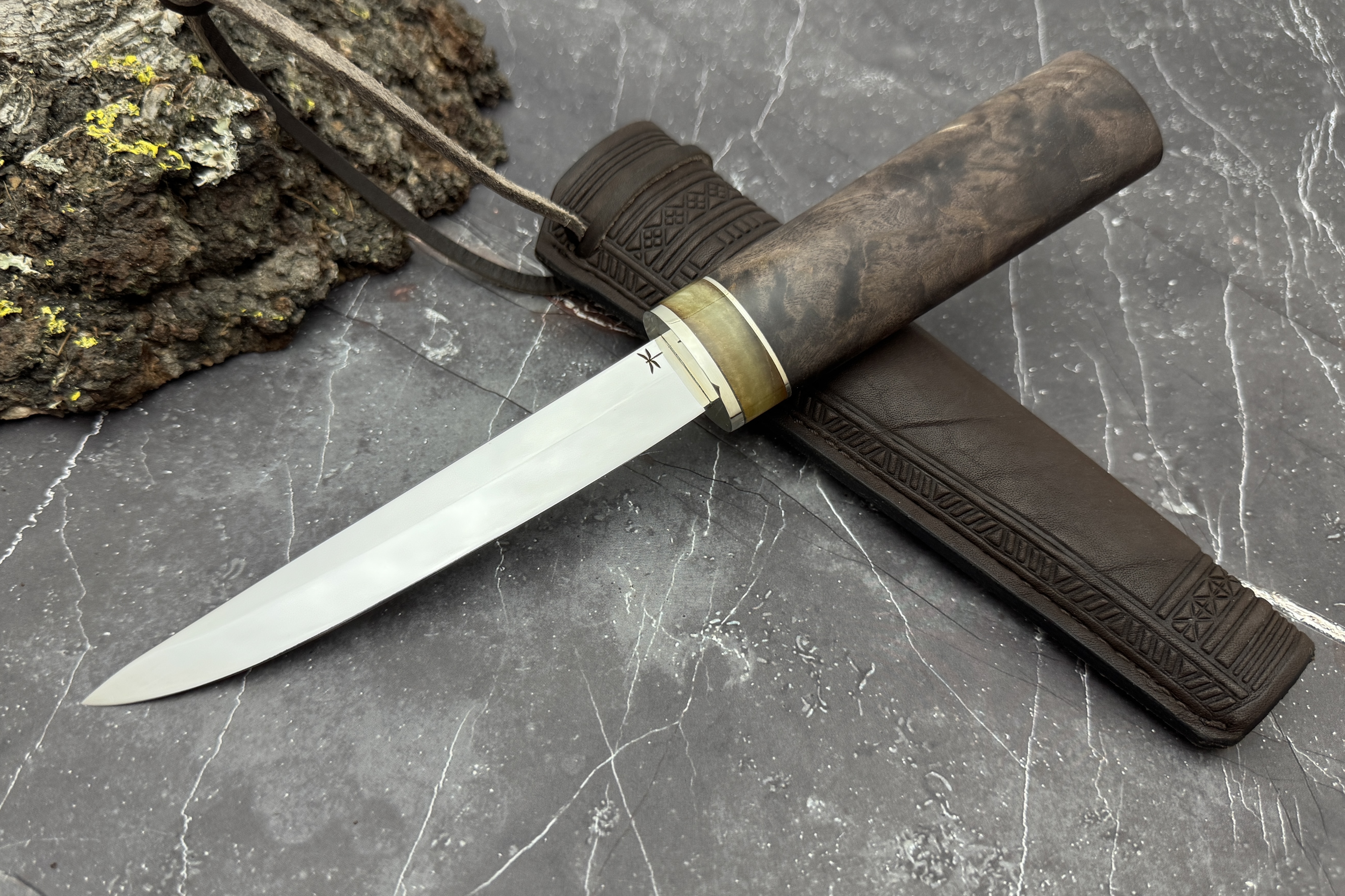 Выполнен нож из стали D2, рукоять из стабилизированной карельской березы, вставка из рога горного барана чубуку, больстер нейзильбер.