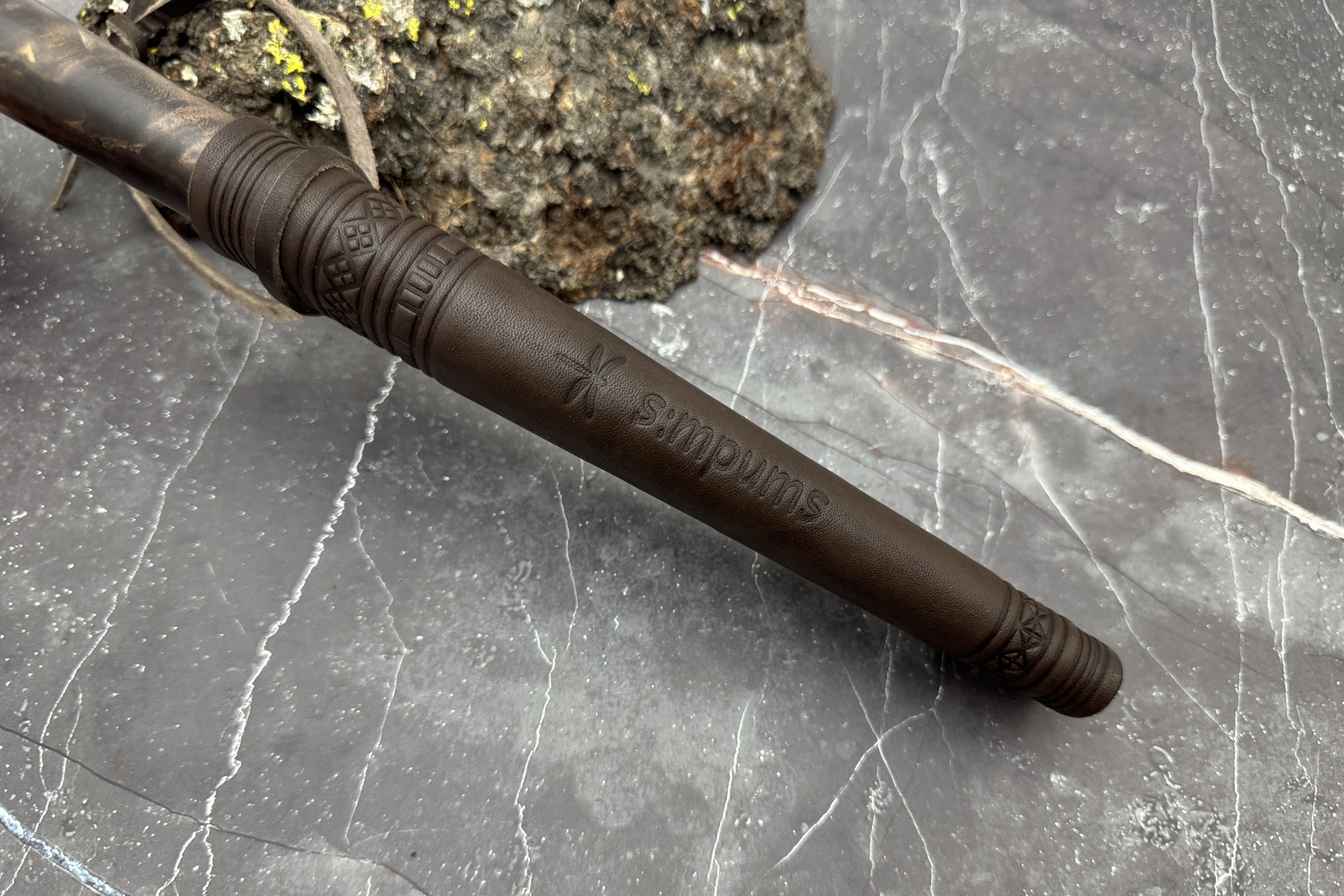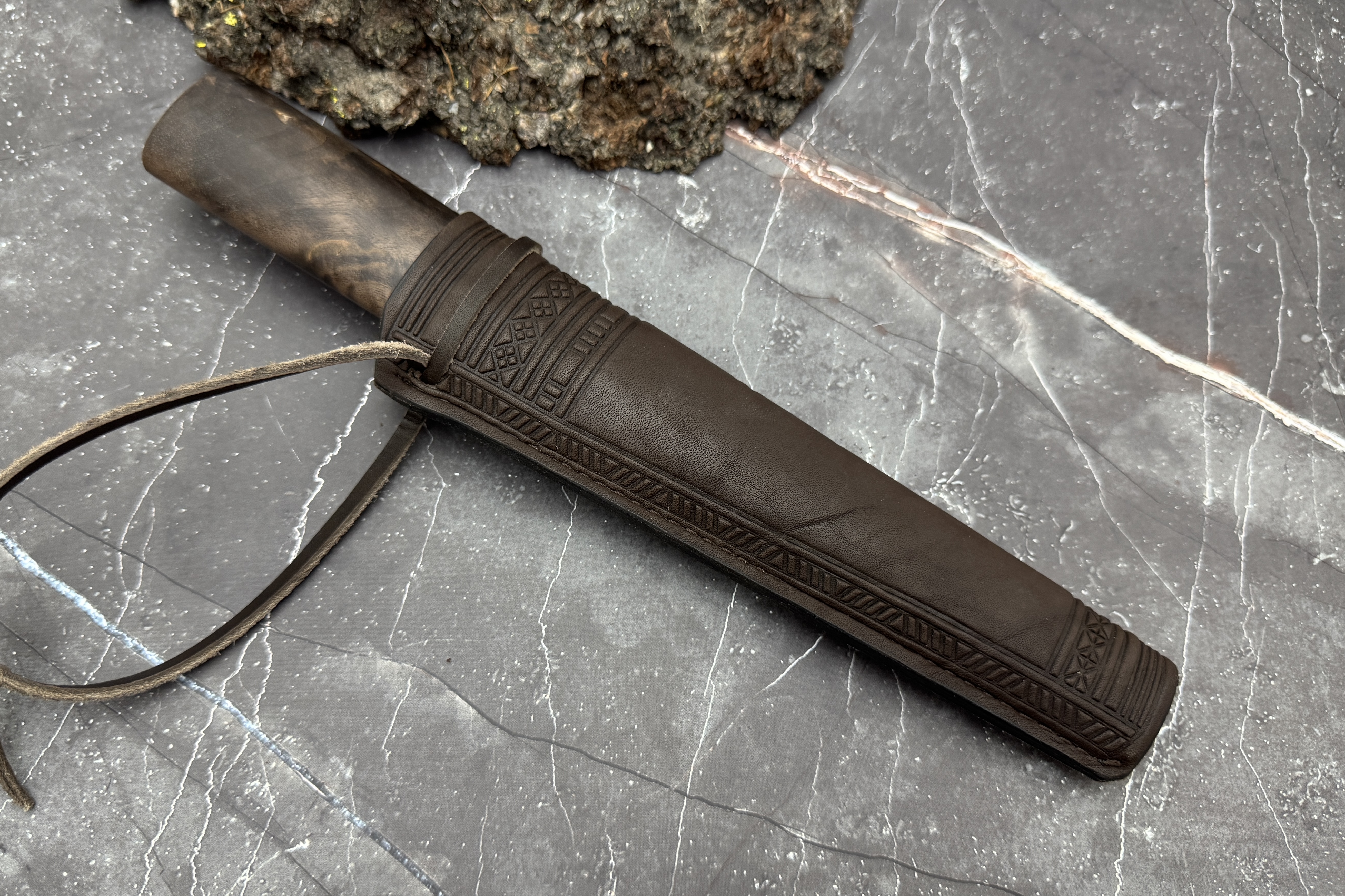 Клинок 130×22×3.7 мм, выполнен из стали D2. Рукоять 120 мм: стабилизированная карельская береза, вставка из рога горного барана чубуку, больстер нейзильбер. Ножны из премиальной кожи с орнаментом, внутри деревянная вставка