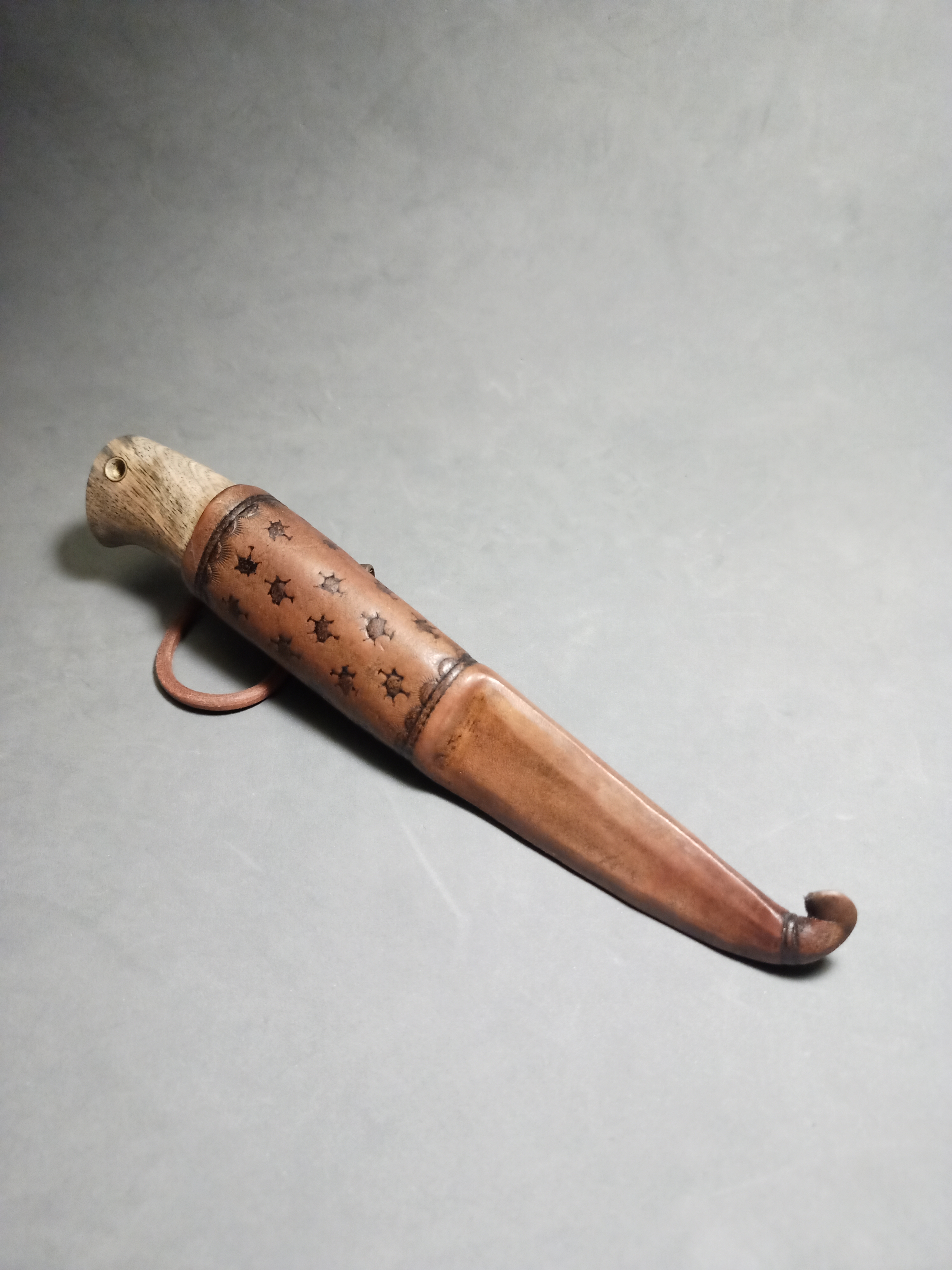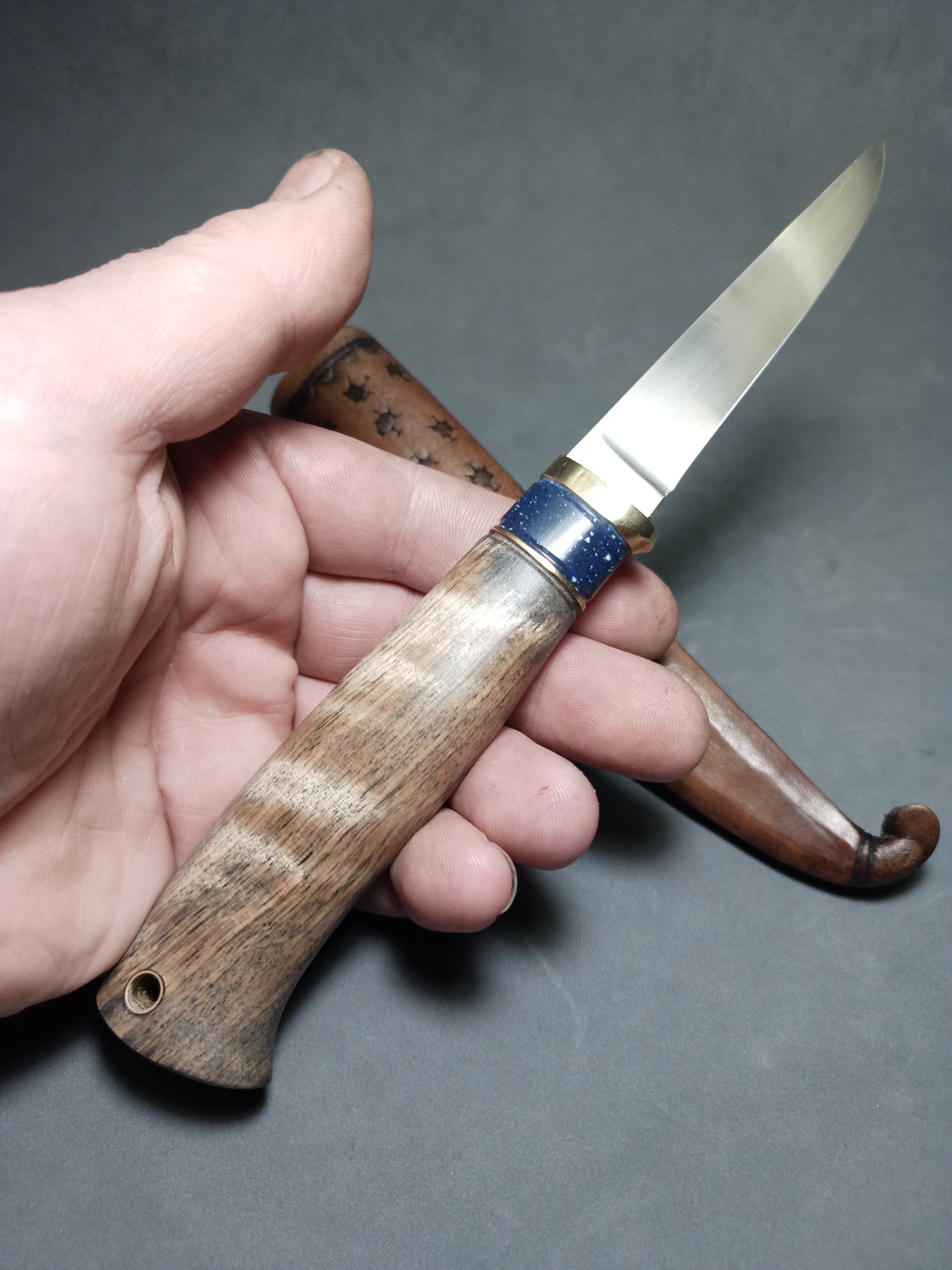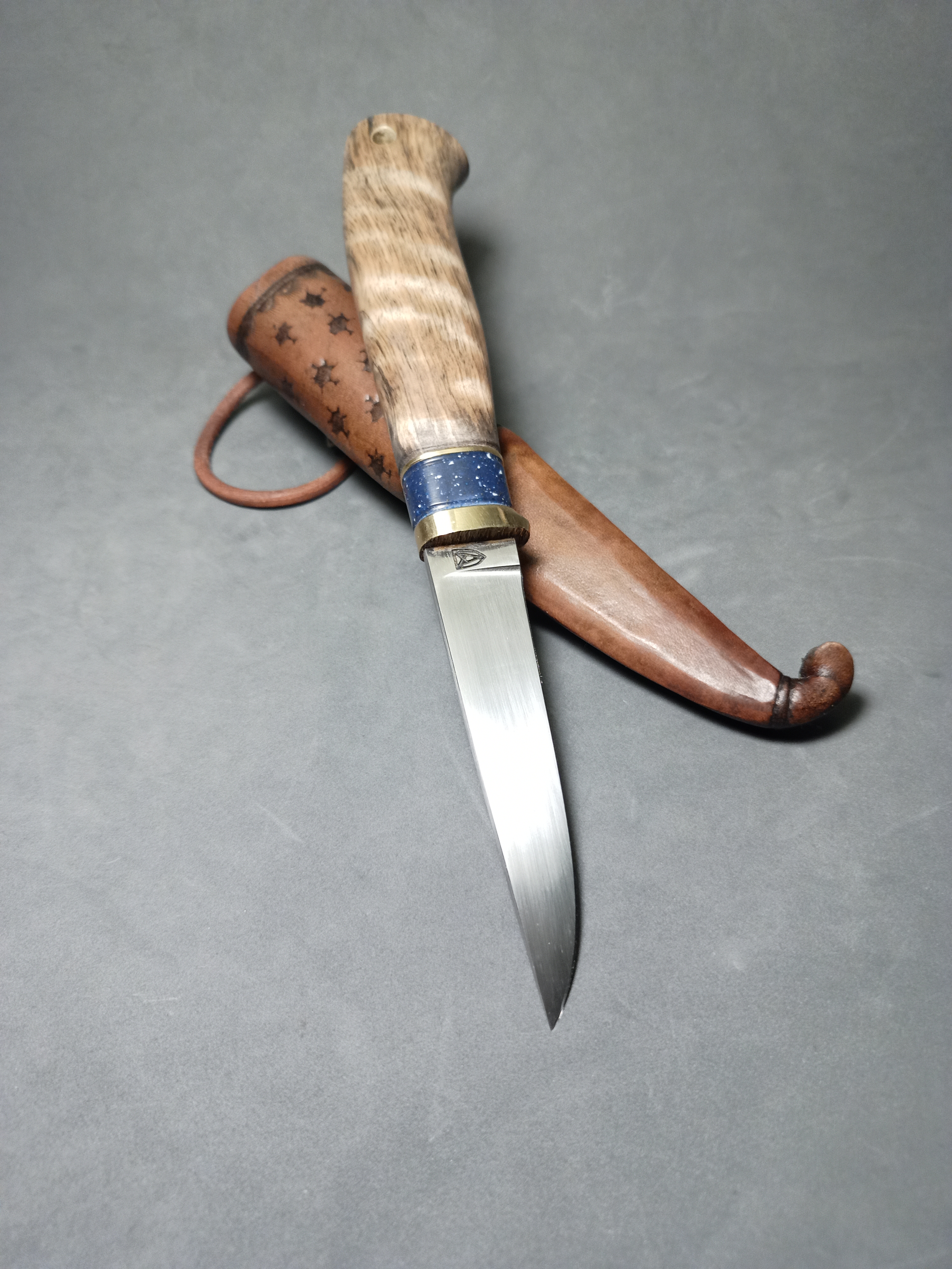 Рукоять- латунь, кориан, стаб.свиль березы. Длина -115мм